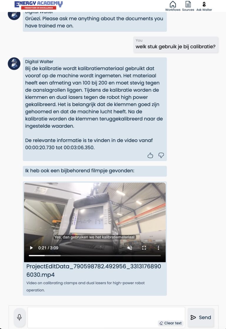 Users don’t browse manuals or search folders. They ask questions and receive context-specific answers, directly traceable to the original source (document, procedure or video moment).